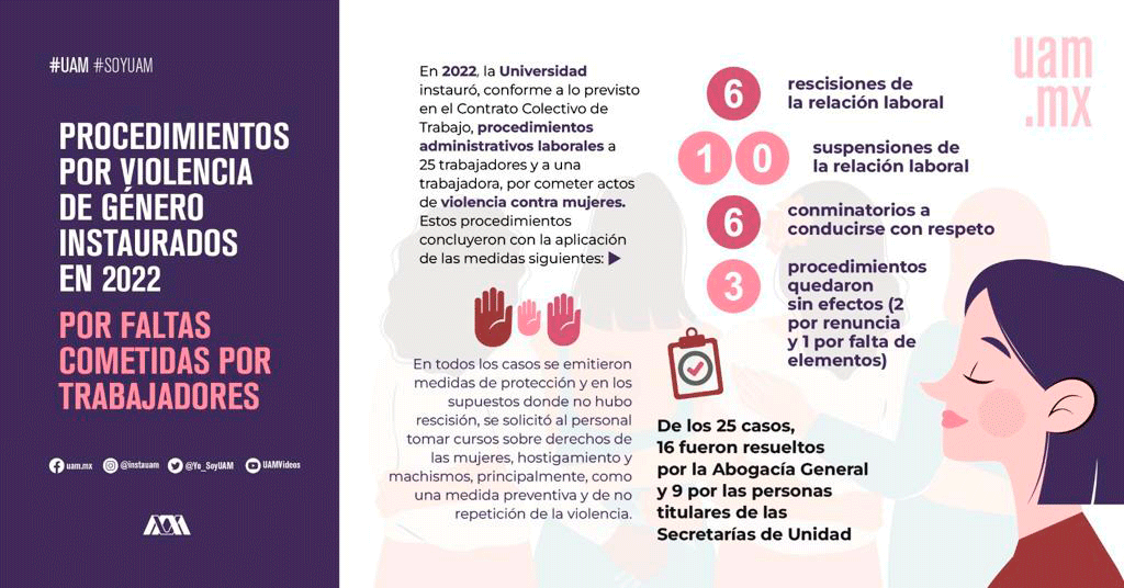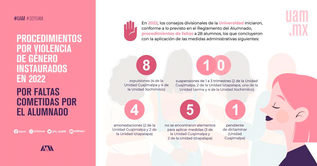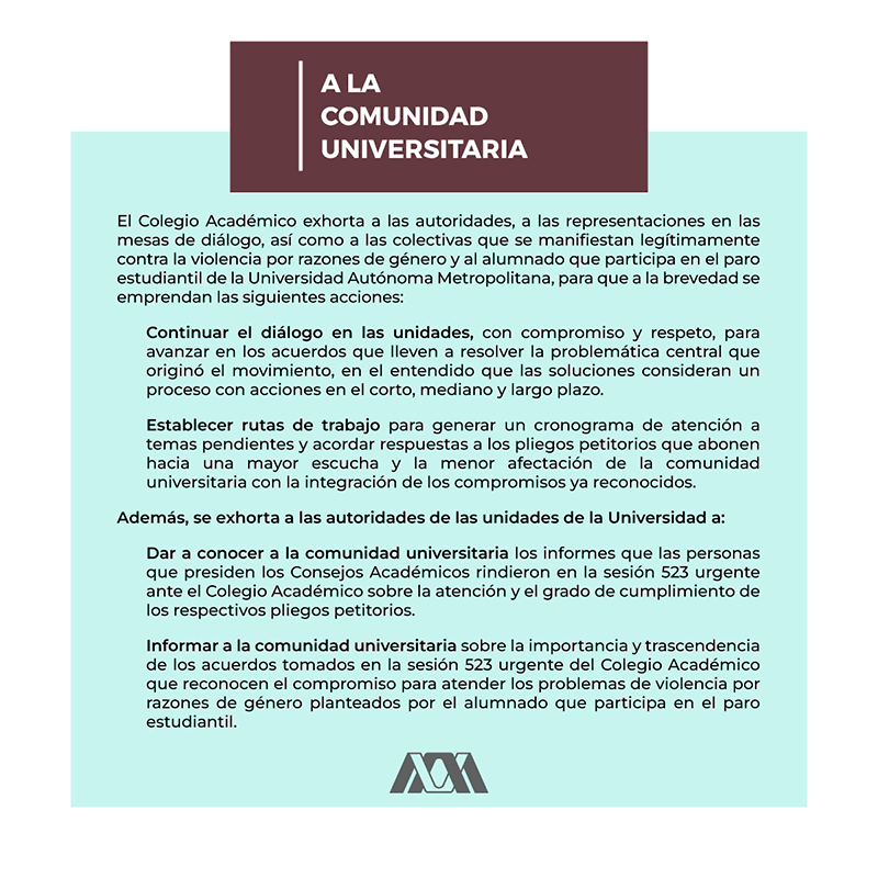 Comunicado de la RG. El Colegio Académico exhorta a las autoridades, a las representaciones en las mesas de diálogo, así como a las colectivas que se manifiestan legítimamente contra la violencia por razones de género y al alumnado que participa en el paro estudiantil de la Universidad Autónoma Metropolitana, para que a la brevedad se emprendan las siguientes acciones.