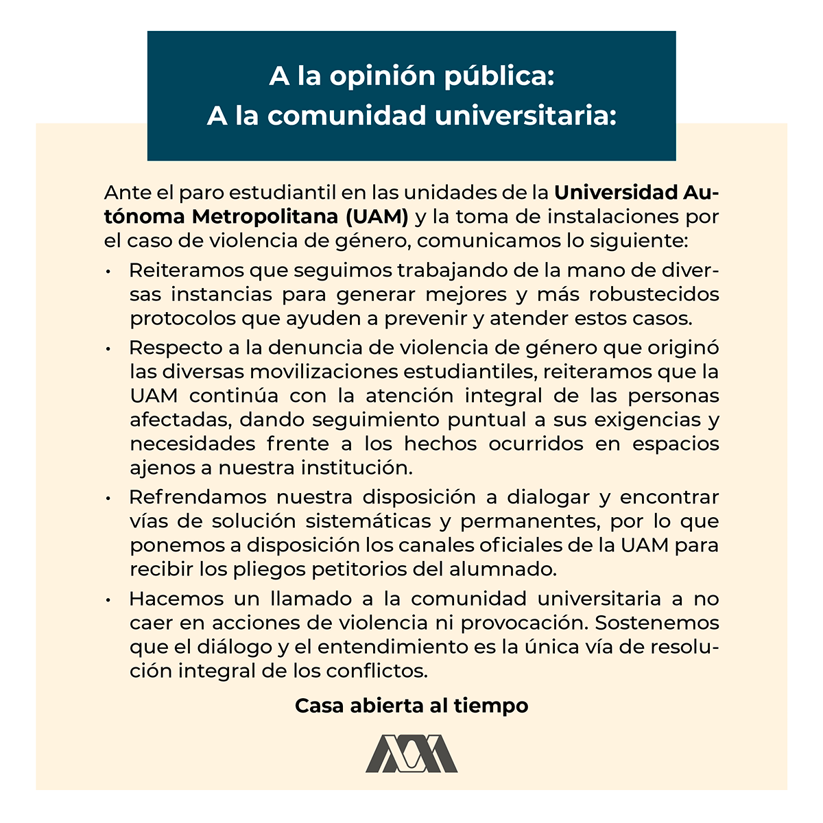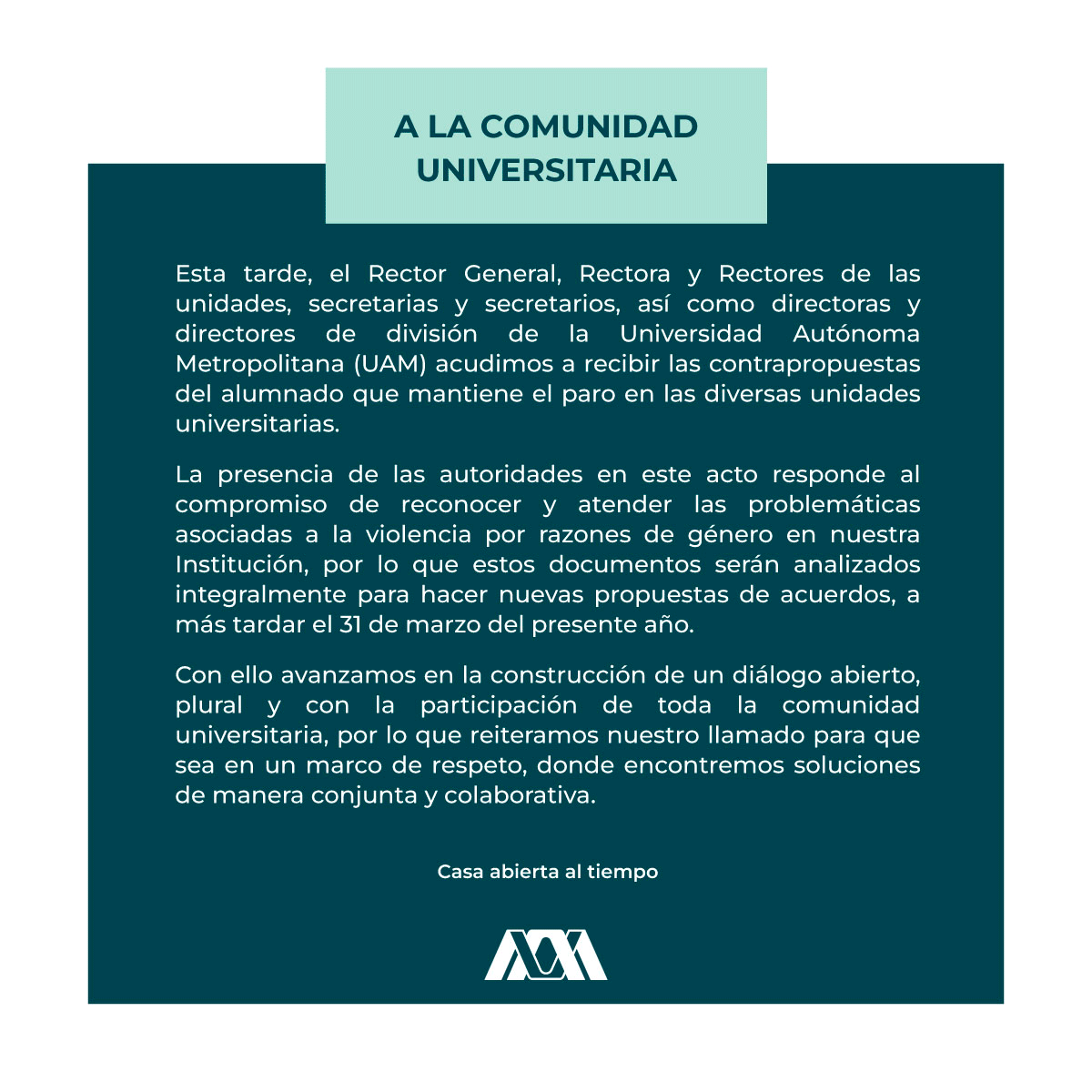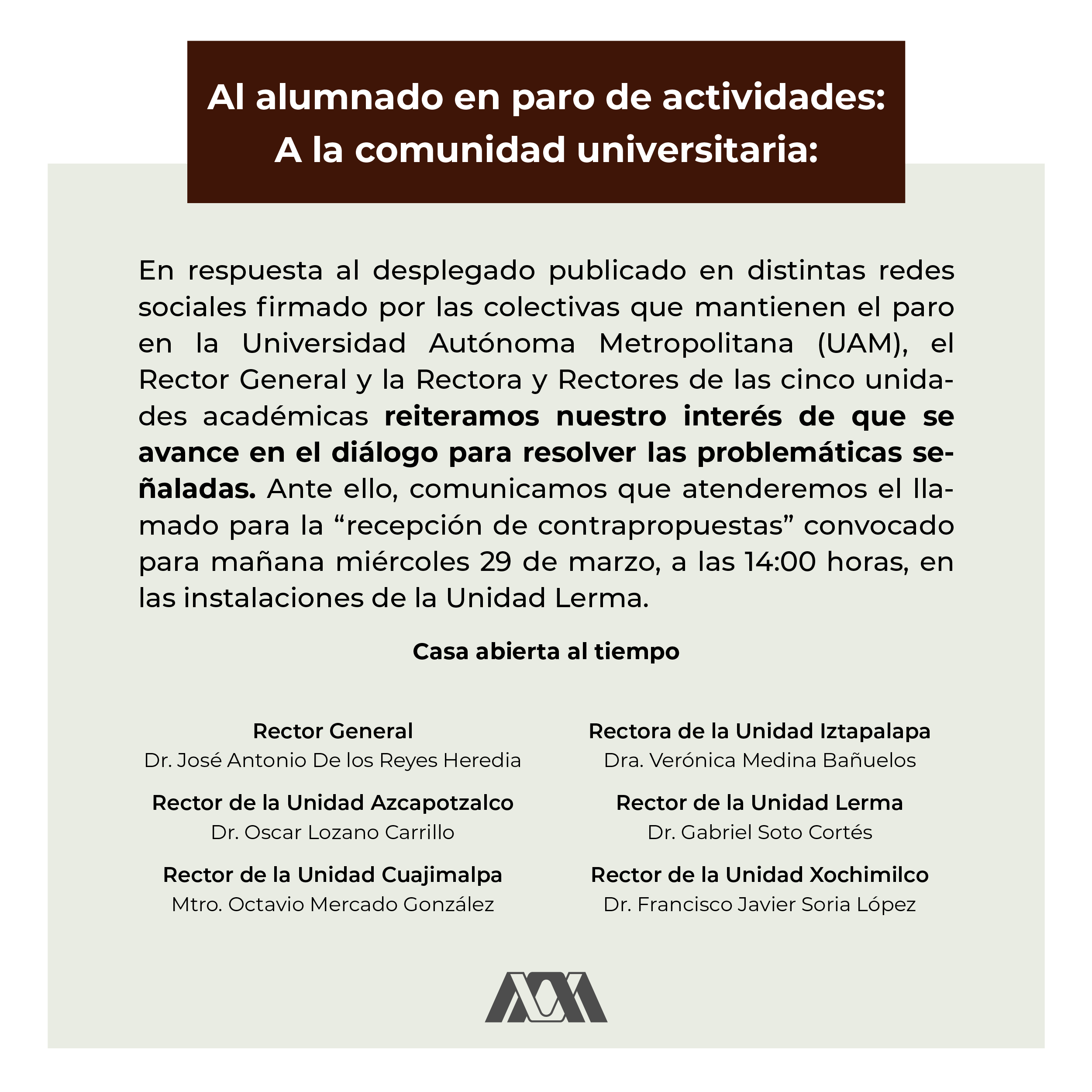 Comunicado de la RG. La Universidad Autónoma Metropolitana (UAM) reconoce las legítimas movilizaciones y exigencias del alumnado.